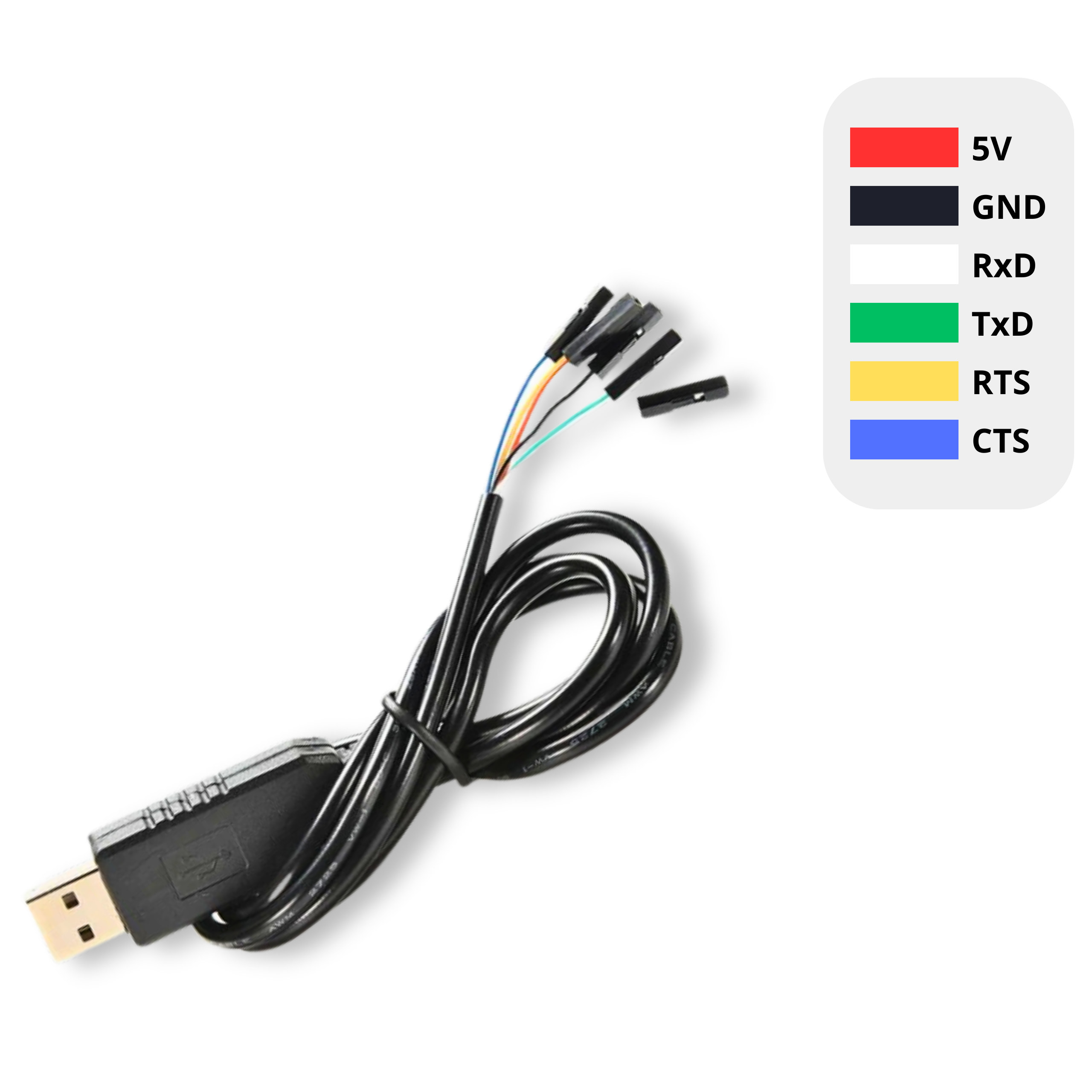 - Wyprowadzenia sygnałów: Vcc 5V, GND, RxD, TxD, RTS, CTS