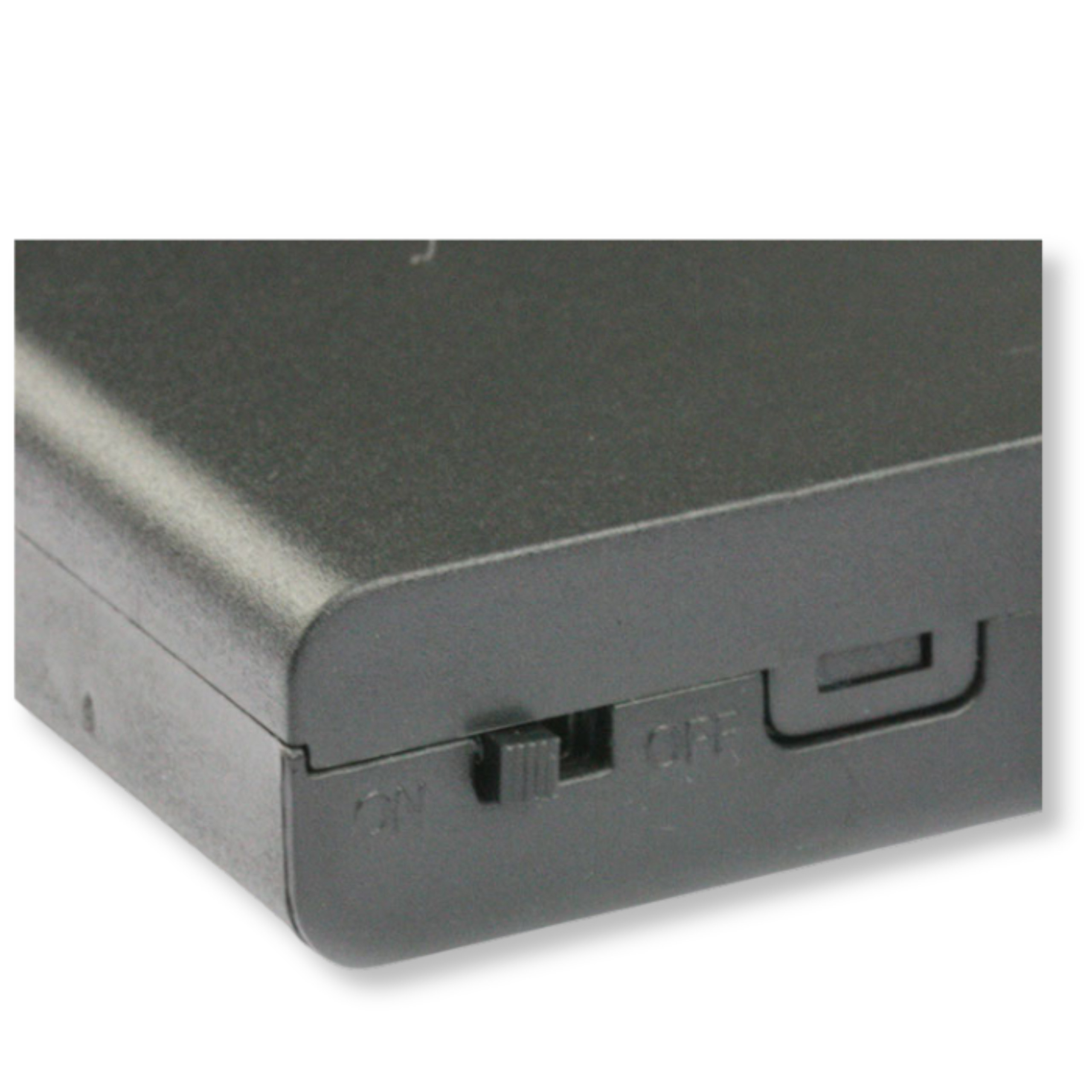 Obudowa jest bardzo kompaktowa, o wymiarach 125x70x20mm, wyposażona w prosty w instalacji i wygodny w użyciu przełącznik ślizgowy do włączania i wyłączania.