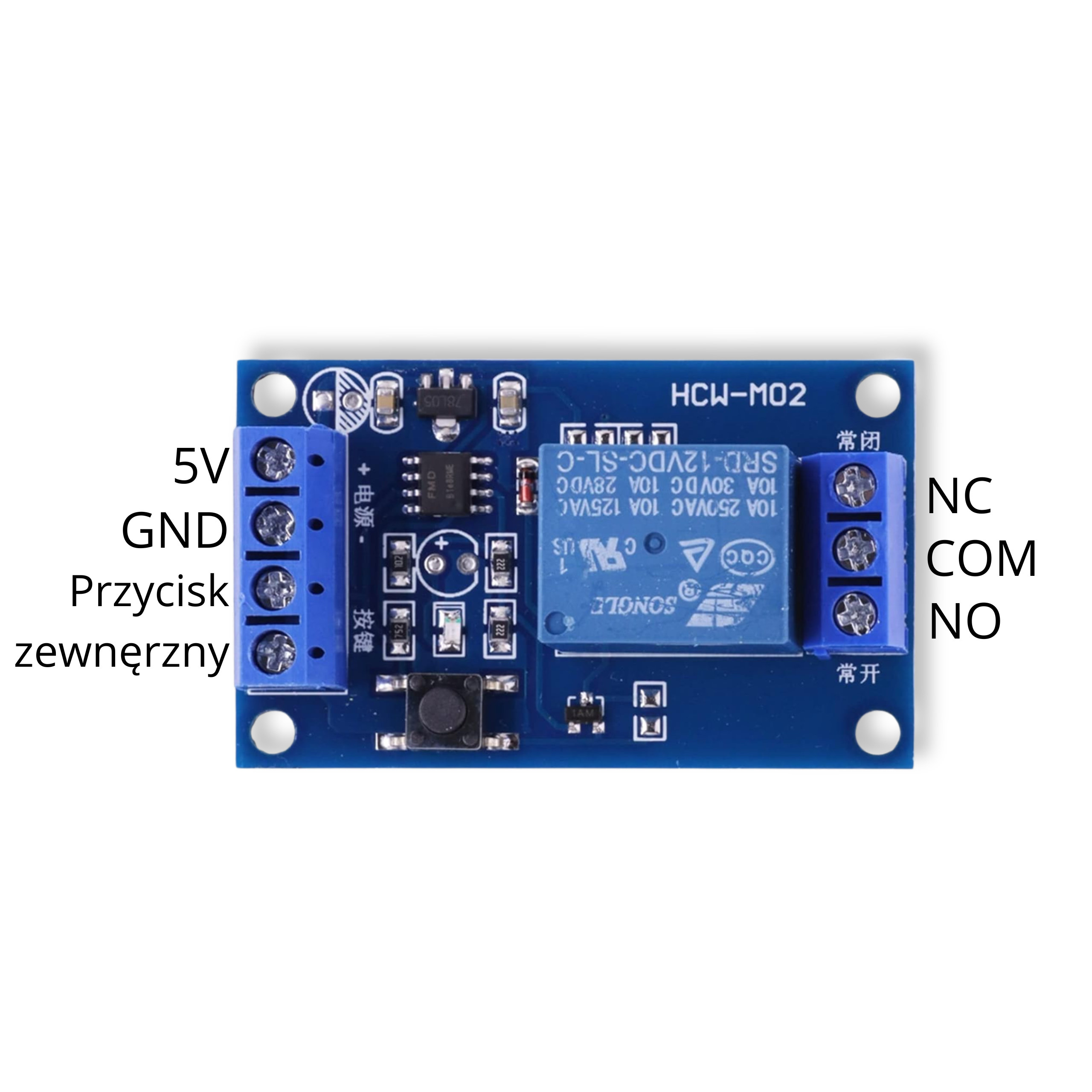 - Zaciski przekaźnika: NC (normalnie zwarty), COM (wspólny), NO (normalnie otwarty)