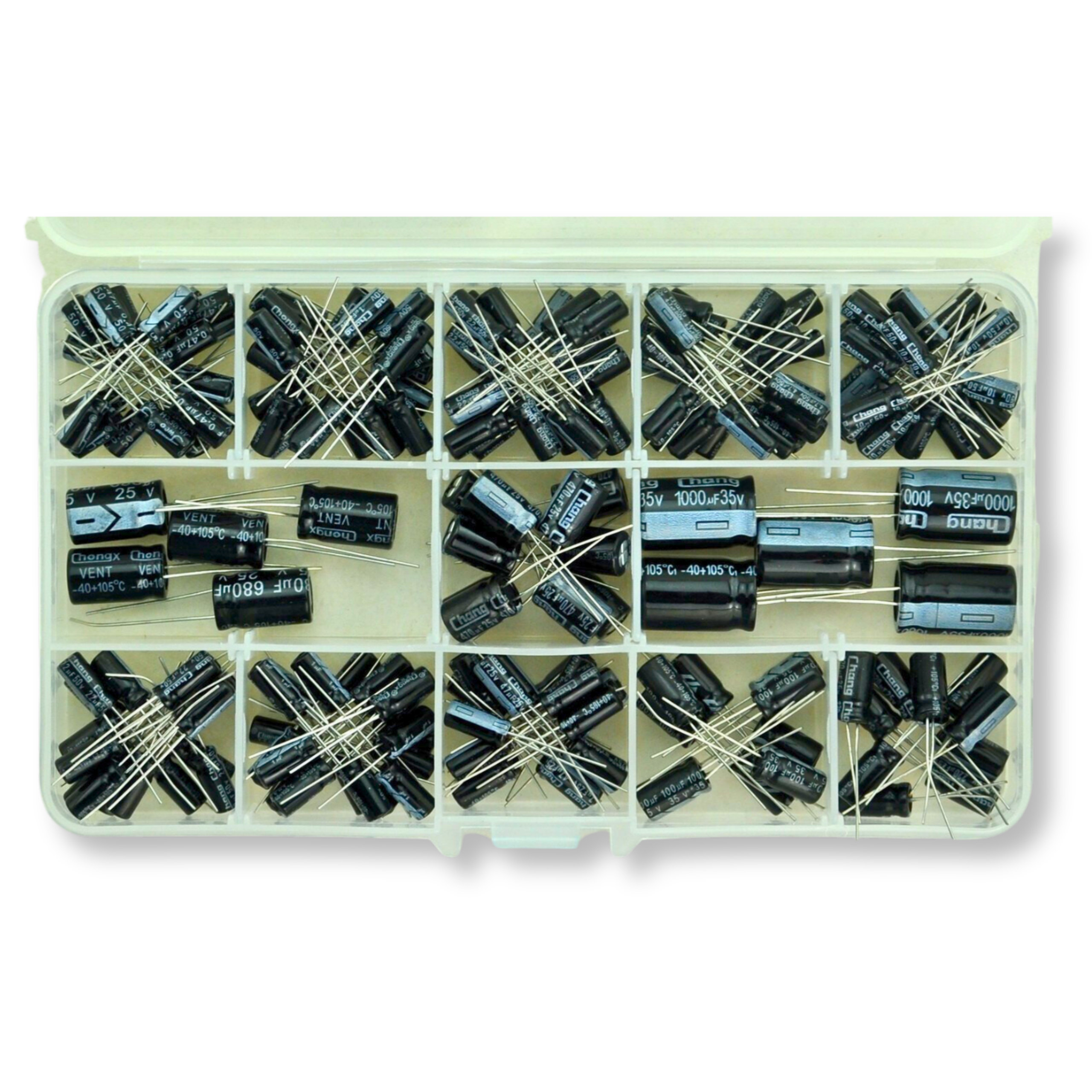 ZESTAW XXL 120 KONDENSATORÓW ELEKTROLITYCZNYCH 12 RODZAJÓW 16/25/50V + BOX
